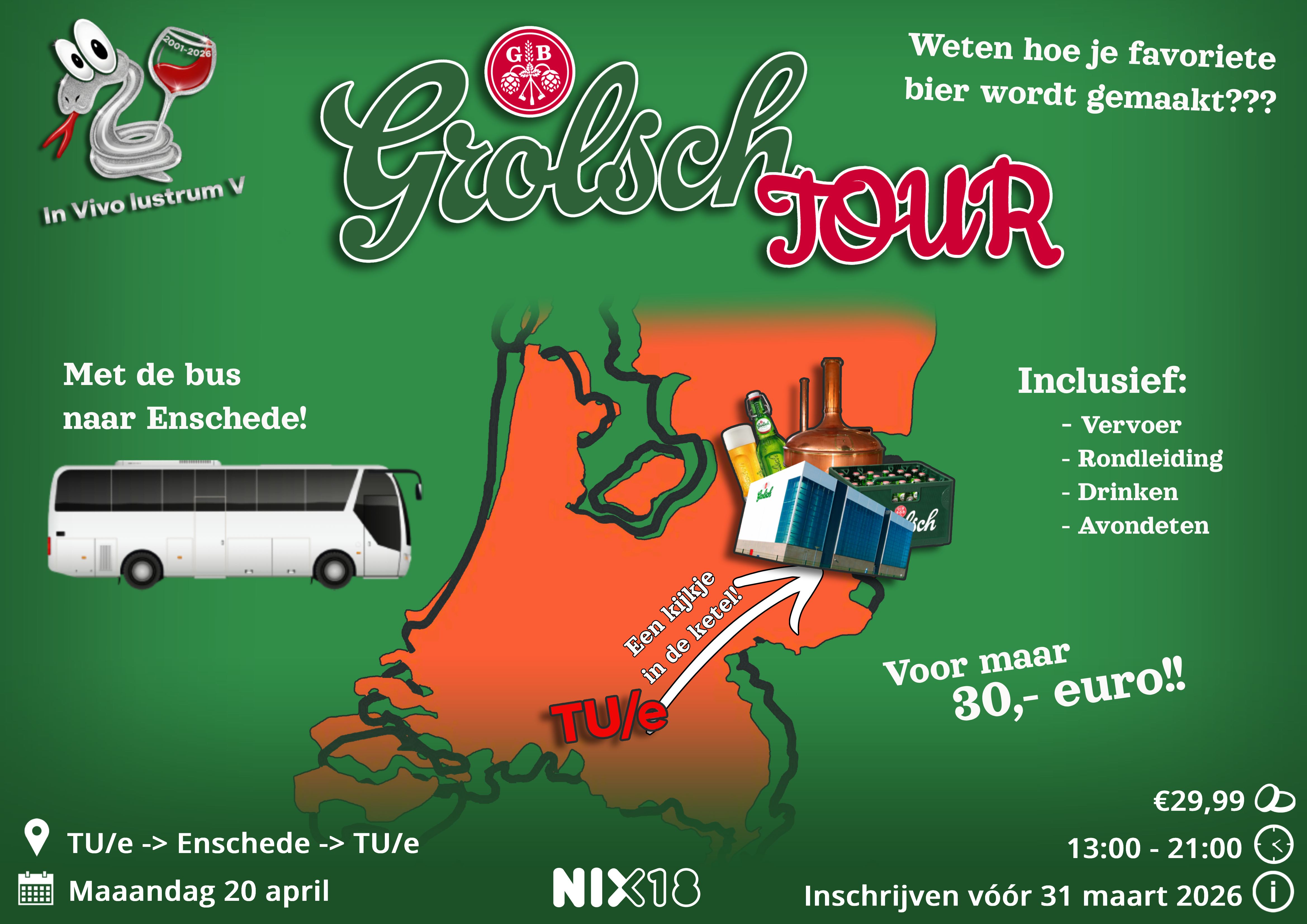 In het lustrumjaar van In Vivo hebben we naast jullie lieve borrelaars nog iets nodig om het jaar tot een mooi jaar te maken. Op 20 April 2026 zullen we in grote getale afreizen richting het mooie Enschede waar onze vrienden in het groen voor ons de deuren zullen openen om een kijkje te nemen in de mooie Grolsch Brouwerij! Ben jij altijd al benieuwd waar die lekkere verkoelende goud gele rakker vandaan komt, dan is dit jouw kans om dit te onderzoeken!